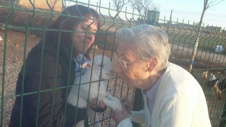 Un gran acontecimiento ha sucedido en la residencia: Lucy, la cabrica ha tenido dos cabritillos y una cabritilla….y estamos super-entretenidos!!! Santiago asistió al parto, Nayara y Lina se empeñaron al día siguiente que había que lavar el culito a los cabritillos y se pusieron manos a la obra con guantes, esponja jabonosa y papel para secar!! increíble el cuadro de las dos en tan difícil tarea. Además, vinieron a verlos también mis sobrinas y,  los abuelos disfrutaron por partida doble: niños y animales.  Todos los días un montón de abuelos acuden a verlos y a acariciar a toda la familia caprina, en la próxima publicación os pongo las fotos de los abuelos con los cabritillos que han hecho los familiares que, por supuesto también disfrutan… Una tarde que estaba dando biberón a los cabritillos aparecieron Consuelo y M@ Pilar por allí a ver cómo les daba de comer y les puse a uno de los cabritillos por la verja y les daban unos besicos…qué tierno y cuánto disfruté y me reí…
