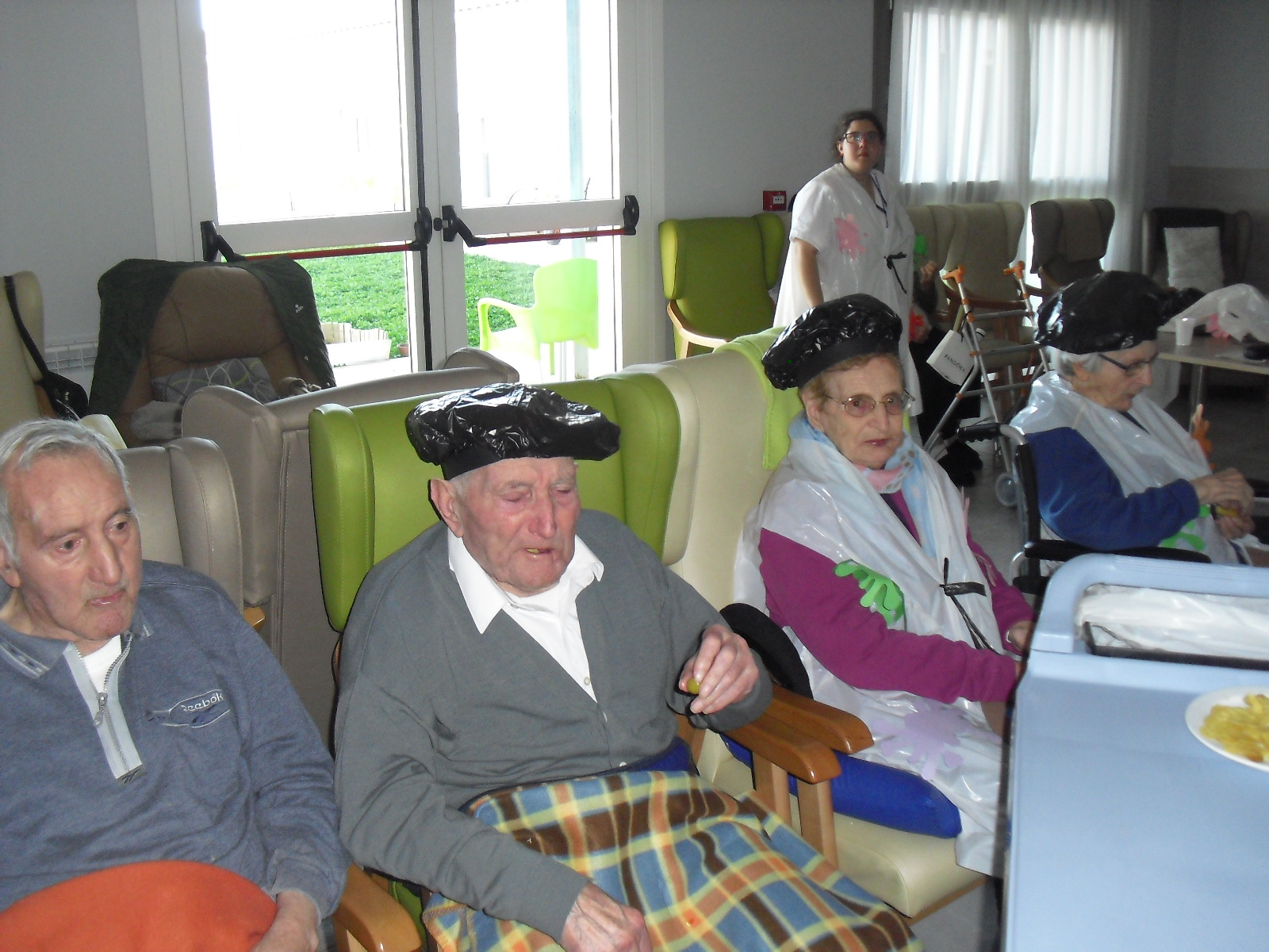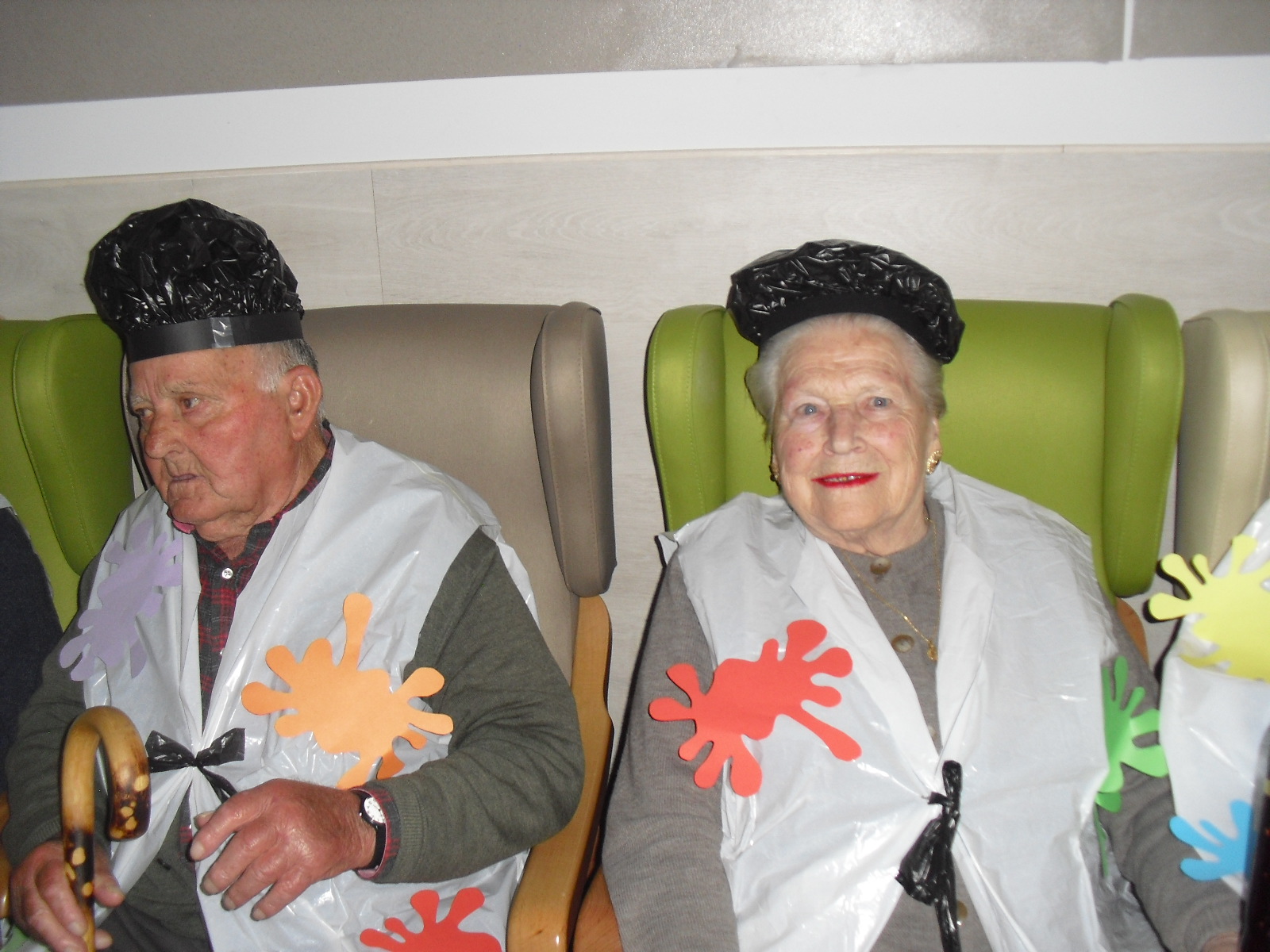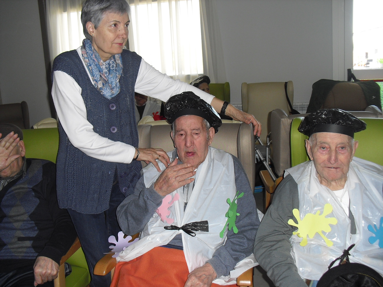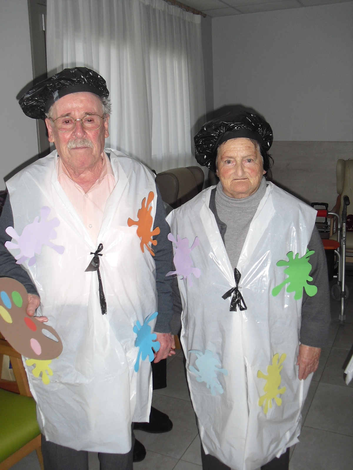Nosotros, como vamos a marcha lenta, pues no tenemos prisa a nada, a estas edades hay que ir poquito a poquito!!! Normalmente vamos en fechas acorde con las celebraciones pero esta vez los carnavales fuimos dos semanas después pero todo nos salió divinamente. Laura trabajó codo a codo con Pilar, una de nuestras residentes que de profesión fue profesora de costura, y confeccionaron los disfraces de pintores y acabamos con una fiesta. Me tuve que poner el sombrero y el poncho de Pablo, pues me lo pidió tantas veces que le hice caso, ese es el motivo por el cual mi disfraz no pega nada de nada con el resto… es una satisfacción verles sonreír y pasar un buen rato y si para terminar les pones buena merienda te suben al altar!!!!!!!!!!