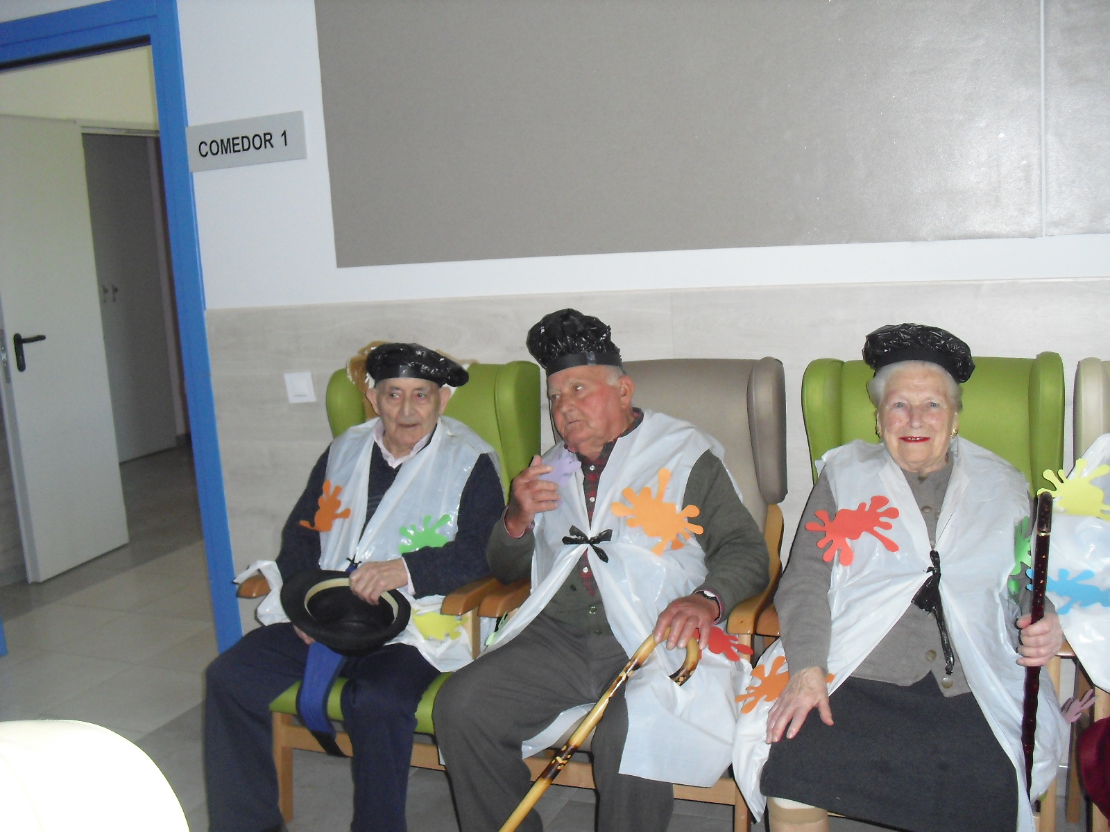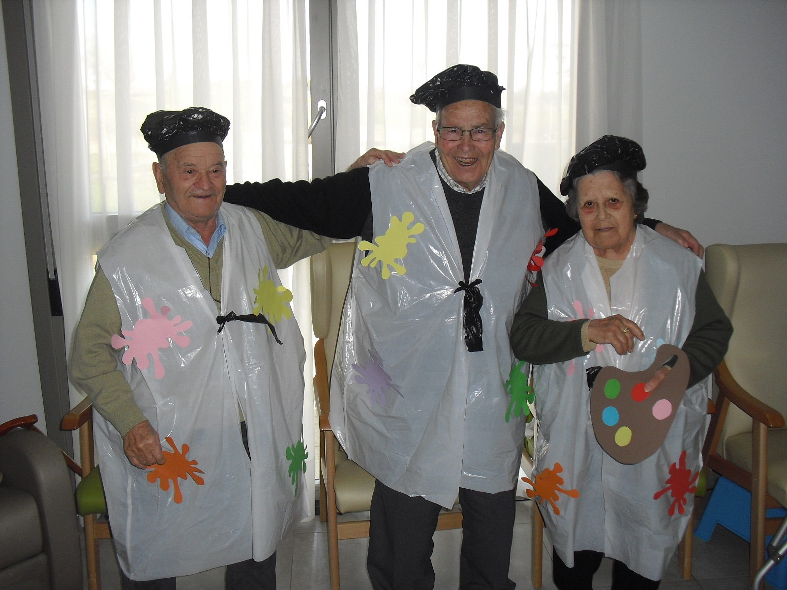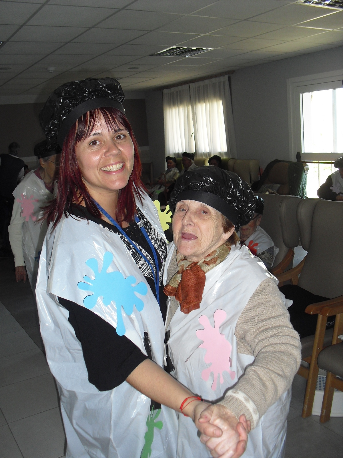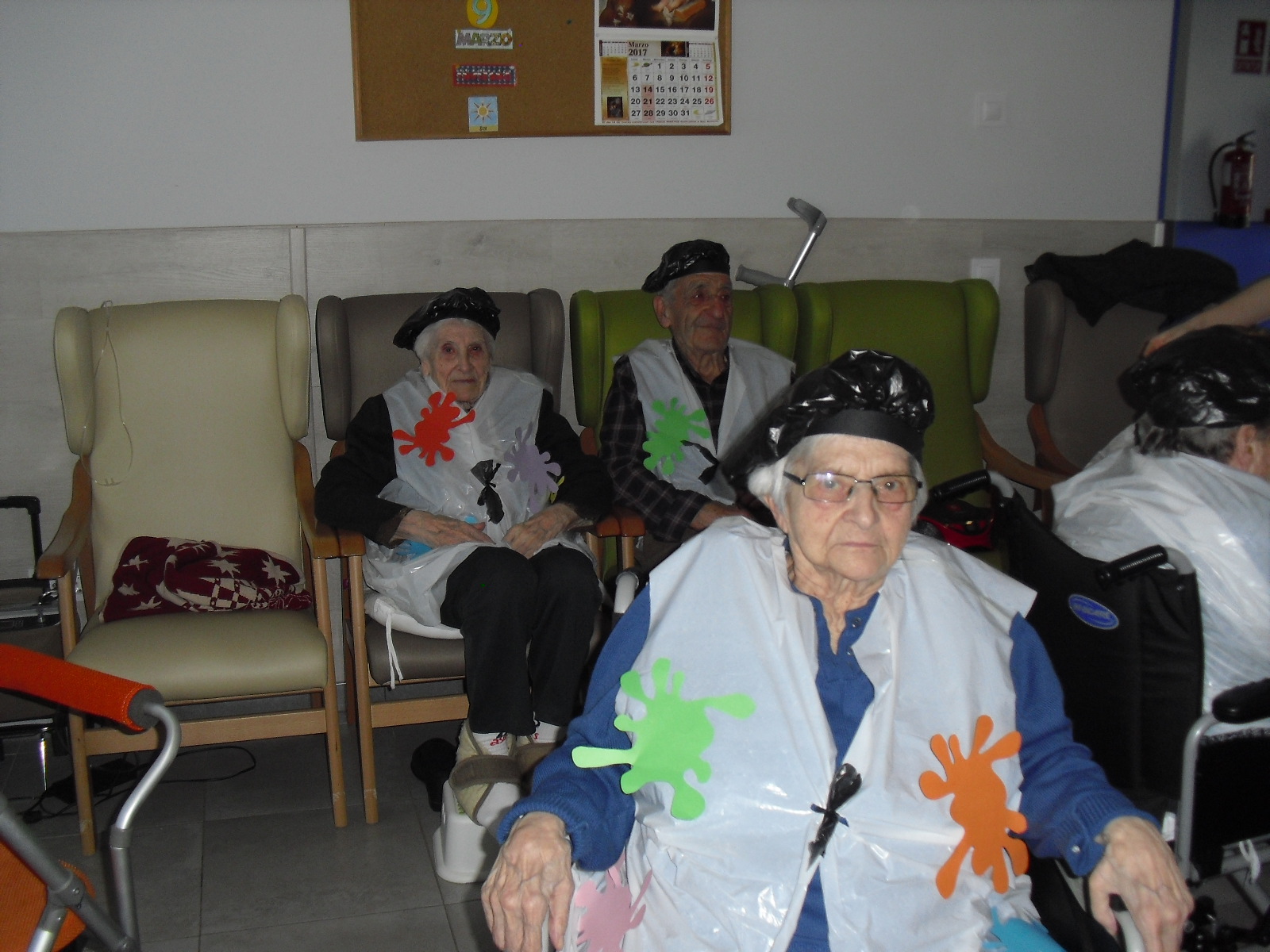 Nosotros, como vamos a marcha lenta, pues no tenemos prisa a nada, a estas edades hay que ir poquito a poquito!!! Normalmente vamos en fechas acorde con las celebraciones pero esta vez los carnavales fuimos dos semanas después pero todo nos salió divinamente. Laura trabajó codo a codo con Pilar, una de nuestras residentes que de profesión fue profesora de costura, y confeccionaron los disfraces de pintores y acabamos con una fiesta. Me tuve que poner el sombrero y el poncho de Pablo, pues me lo pidió tantas veces que le hice caso, ese es el motivo por el cual mi disfraz no pega nada de nada con el resto… es una satisfacción verles sonreír y pasar un buen rato y si para terminar les pones buena merienda te suben al altar!!!!!!!!!!