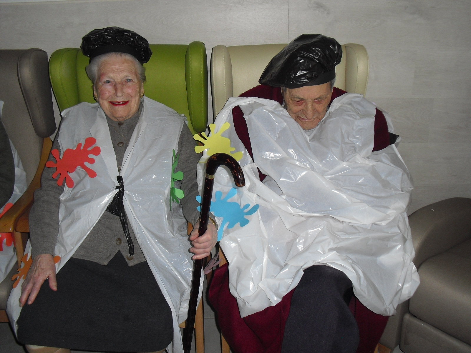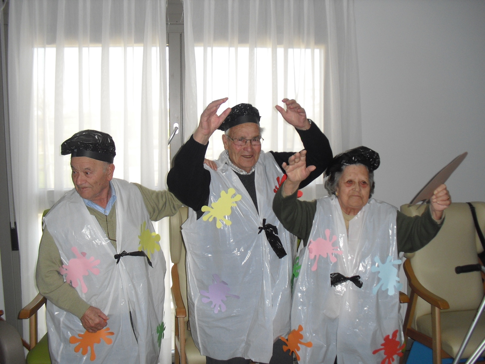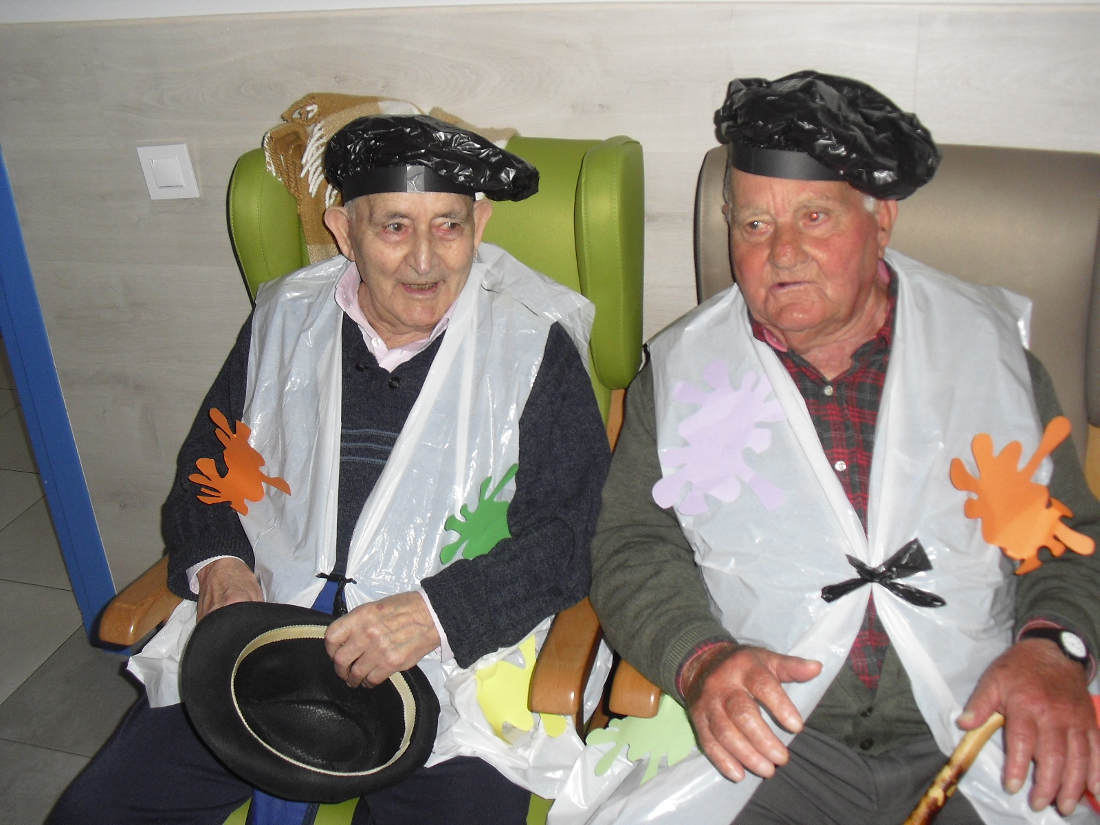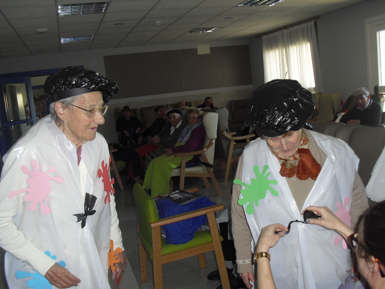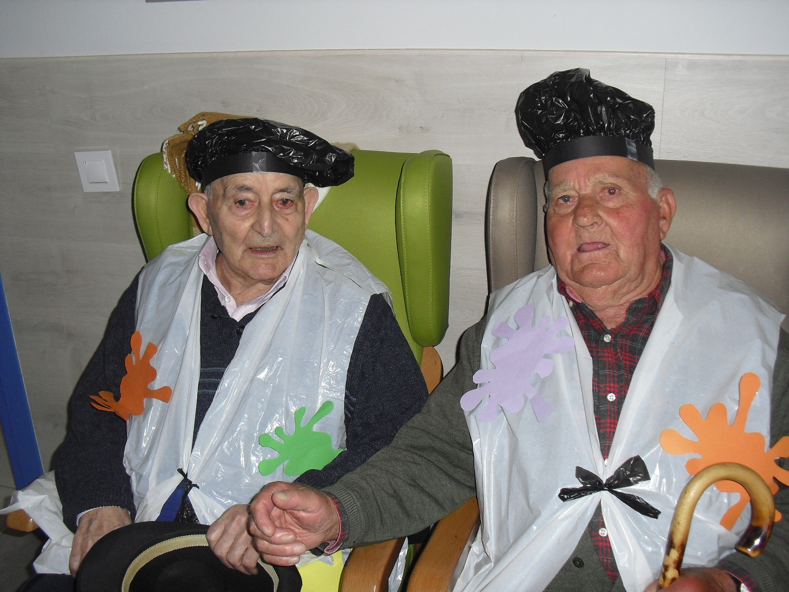 Nosotros, como vamos a marcha lenta, pues no tenemos prisa a nada, a estas edades hay que ir poquito a poquito!!! Normalmente vamos en fechas acorde con las celebraciones pero esta vez los carnavales fuimos dos semanas después pero todo nos salió divinamente. Laura trabajó codo a codo con Pilar, una de nuestras residentes que de profesión fue profesora de costura, y confeccionaron los disfraces de pintores y acabamos con una fiesta. Me tuve que poner el sombrero y el poncho de Pablo, pues me lo pidió tantas veces que le hice caso, ese es el motivo por el cual mi disfraz no pega nada de nada con el resto… es una satisfacción verles sonreír y pasar un buen rato y si para terminar les pones buena merienda te suben al altar!!!!!!!!!!