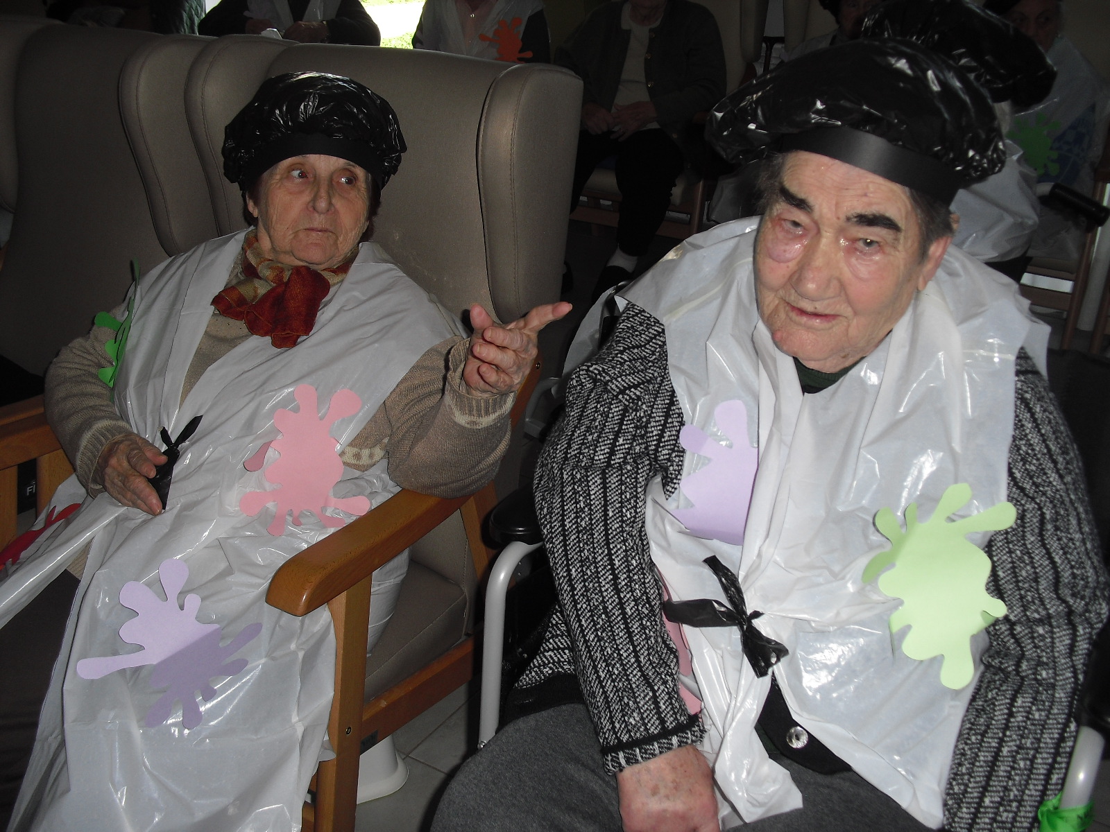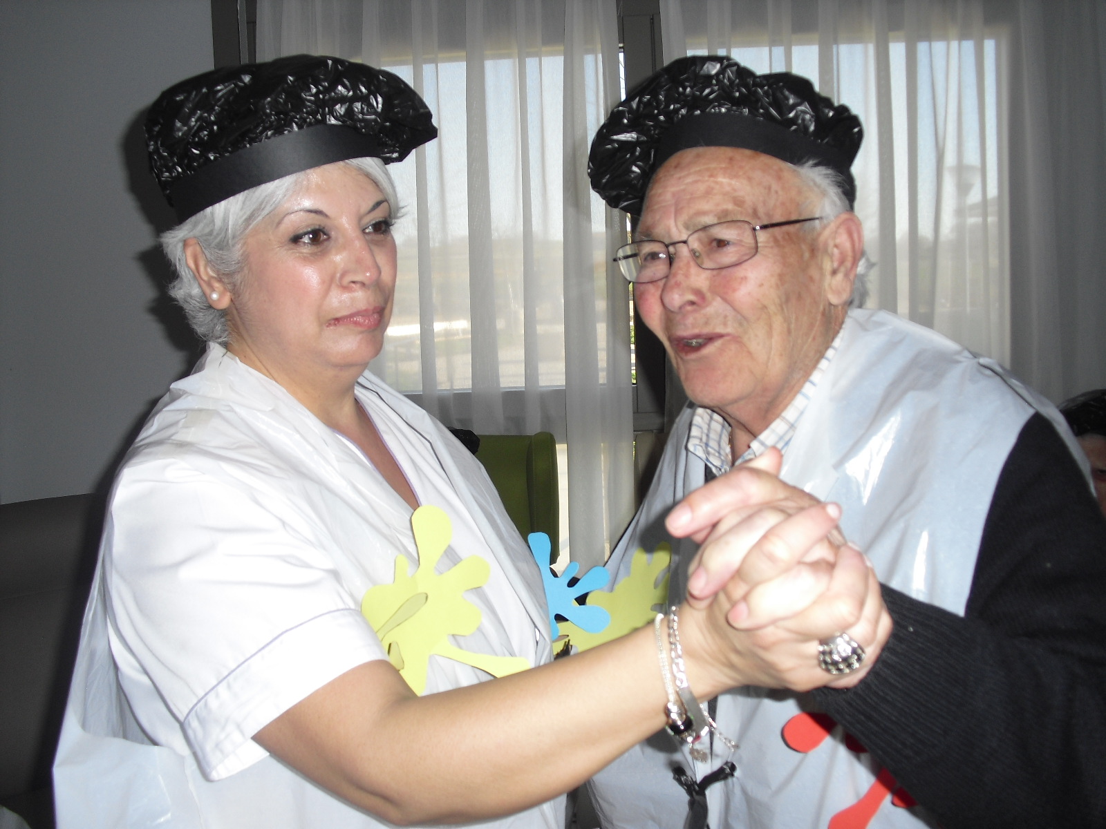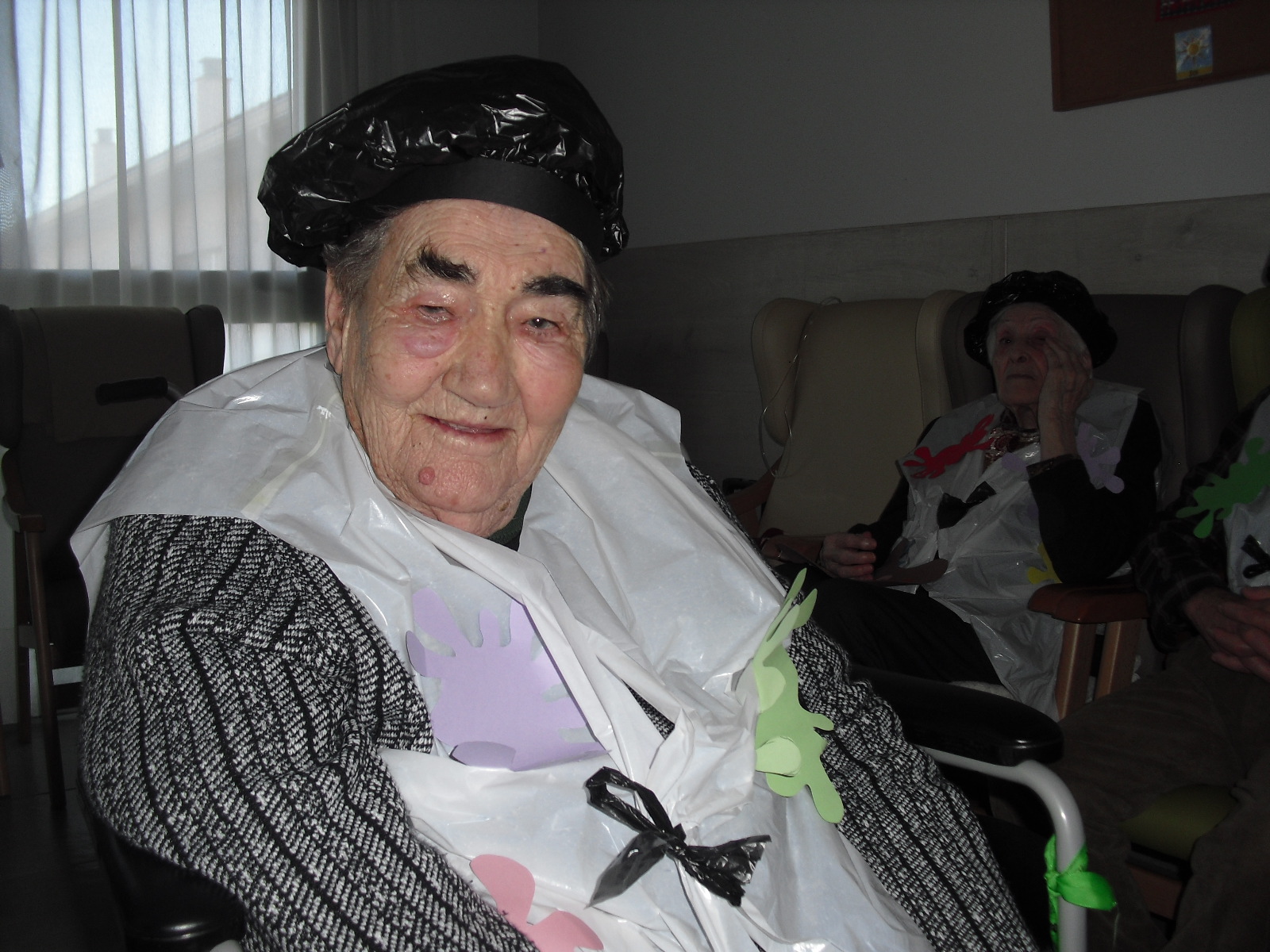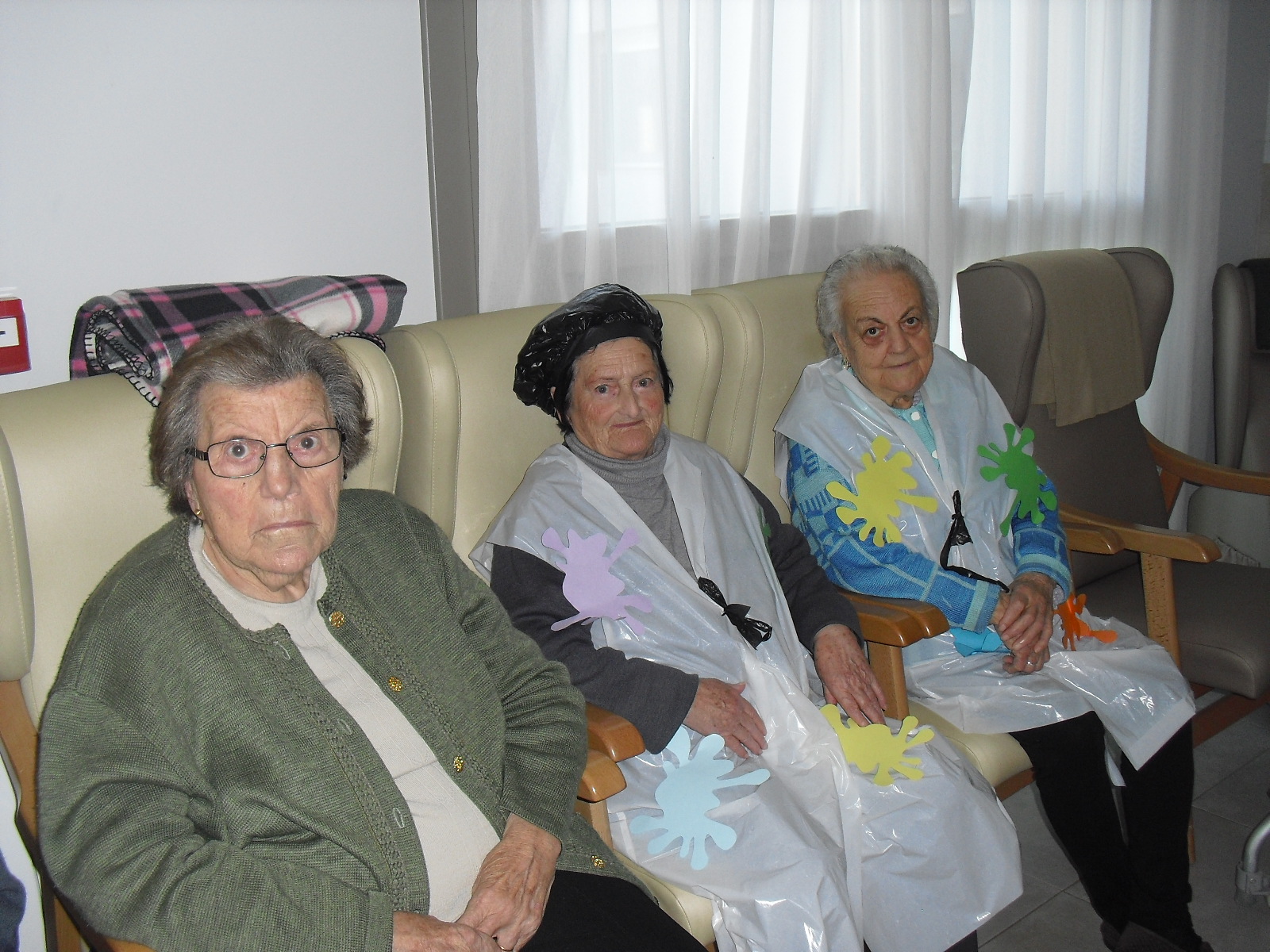 Nosotros, como vamos a marcha lenta, pues no tenemos prisa a nada, a estas edades hay que ir poquito a poquito!!! Normalmente vamos en fechas acorde con las celebraciones pero esta vez los carnavales fuimos dos semanas después pero todo nos salió divinamente. Laura trabajó codo a codo con Pilar, una de nuestras residentes que de profesión fue profesora de costura, y confeccionaron los disfraces de pintores y acabamos con una fiesta. Me tuve que poner el sombrero y el poncho de Pablo, pues me lo pidió tantas veces que le hice caso, ese es el motivo por el cual mi disfraz no pega nada de nada con el resto… es una satisfacción verles sonreír y pasar un buen rato y si para terminar les pones buena merienda te suben al altar!!!!!!!!!!