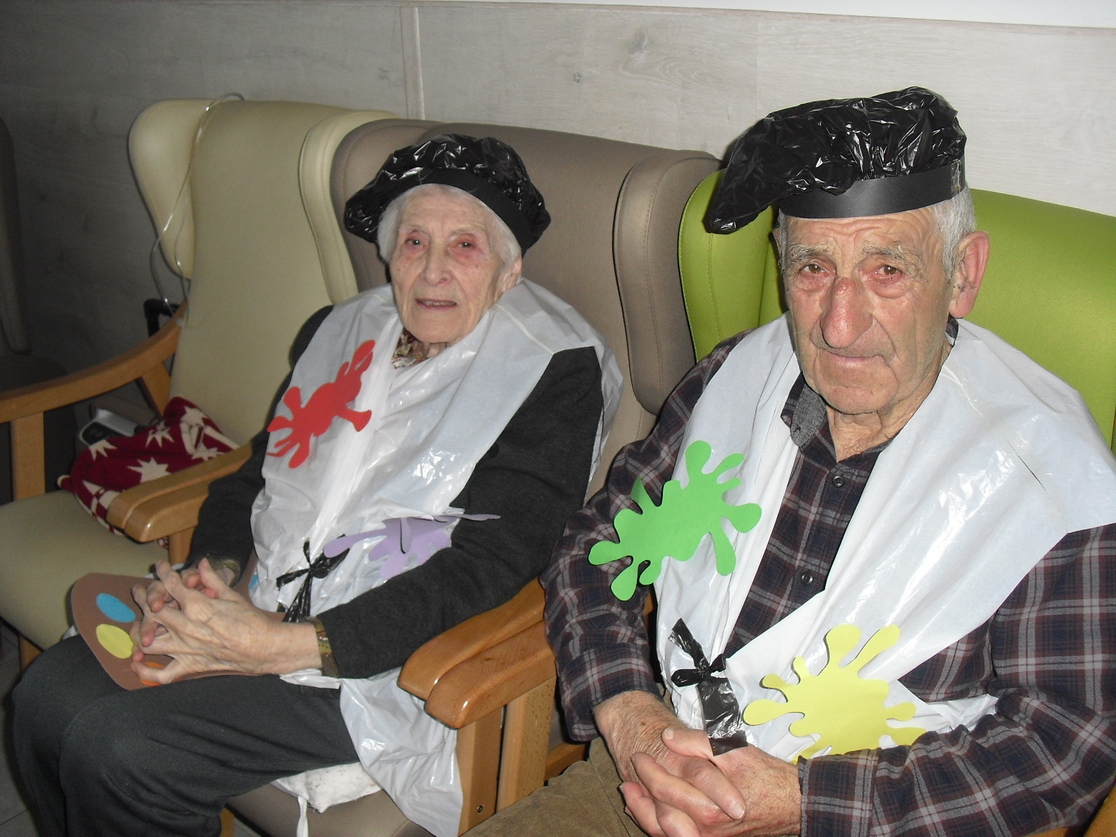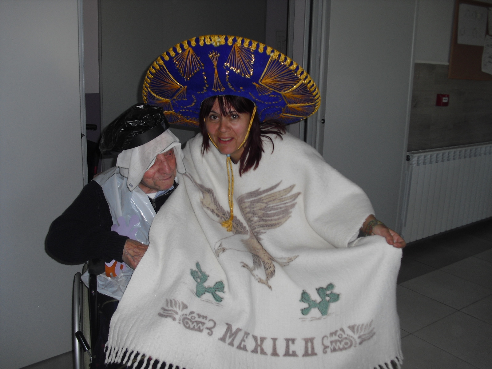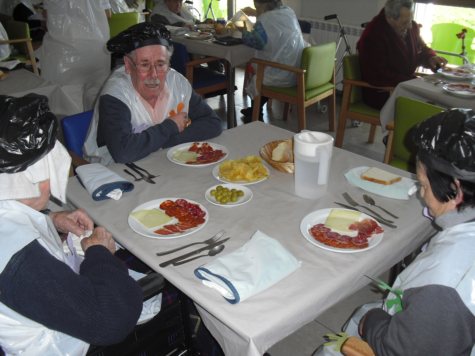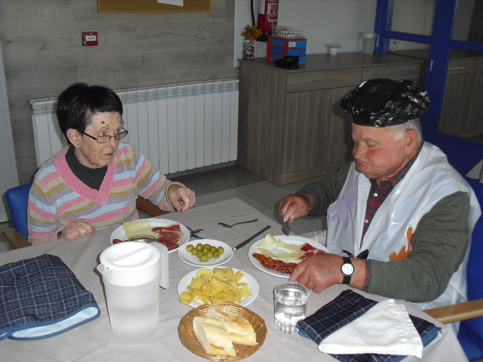 Nosotros, como vamos a marcha lenta, pues no tenemos prisa a nada, a estas edades hay que ir poquito a poquito!!! Normalmente vamos en fechas acorde con las celebraciones pero esta vez los carnavales fuimos dos semanas después pero todo nos salió divinamente. Laura trabajó codo a codo con Pilar, una de nuestras residentes que de profesión fue profesora de costura, y confeccionaron los disfraces de pintores y acabamos con una fiesta. Me tuve que poner el sombrero y el poncho de Pablo, pues me lo pidió tantas veces que le hice caso, ese es el motivo por el cual mi disfraz no pega nada de nada con el resto… es una satisfacción verles sonreír y pasar un buen rato y si para terminar les pones buena merienda te suben al altar!!!!!!!!!!