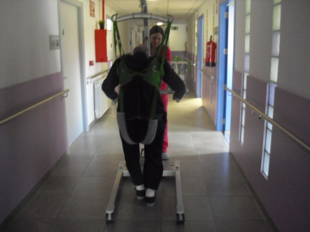 Mi objetivo en nuestra residencia es mejorar la calidad de vida de los pacientes. Por muchas razones, porque repercute directamente en su bienestar y, además mejora directamente la calidad de la atención del personal asistencial. Cuando tenemos un paciente con una pequeña posibilidad de que apoye sus piernas enseguida se lo transmito a Bea, nuestra fisioterapeuta y Laura, nuestra terapeuta y comenzamos a fortalecer esas piernas ya que los pacientes con movilidad reducida para ayudar al tránsito intestinal hay que ponerse de pie, y si además pueden conseguir que anden…la cara de ellos es un poema. Todo hay que decirlo a algunos les sabe malo que empecemos a darles caña cuando se han acostumbrado a que les dejen “aletargados” …pero casi siempre entran al trapo y luego lo agradecen y les encanta viajar en la grúa, es como una moto moderna!!! Este trabajo se debe realizar con todo el equipo, pues luego es necesario que las gerocultoras utilicen las grúas indicadas con cada paciente, ya que sino lo hacen el esfuerzo de Laura y Bea es insuficiente. Todo mi equipo sabe que no me gustan las sillas de ruedas y que, sólo dejo entrar en Sala de Día y comedores, las justas y necesarias. Los que apoyan  los pies y siguen teniendo fuerza en sus piernas es un regalo para nosotras y facilita nuestro trabajo un 90%. Ya saben que en el protocolo de los cambios de pañal indico como se le moviliza y si pone grúa hay que usarla pues si no las veo me enfado. Nuestras grandes aliadas son las grúas Liko, por mi experiencia puedo decir que las mejores grúas del mercado y tenemos dos bipedestadoras Sabina, para los cambios de pañal.  Bautizadas con el nombre de Sabina, la bipedestadora normal y Katrina, la bipedestadora con percha ancha para las personas que tienen inmovilizados uno o dos brazos y con demasiado deterioro cognitivo para hacer que los brazos queden por fuera. Y la grúa estrella, sin quitar mérito a Sabina y Katrina, es la grúa de transferencia Viking M, bautizada con el nombre de Vicky. Fabricada en aluminio hace que su peso sea el menor posible facilitando su manejo y puede elevar 205kg. Es una grúa versatil de gran ayuda para el entrenamiento de la andada y la rehabilitación, eso es lo que le hace especial. Bea estaba limitadas con las otras grúas pues Sabina y Katrina le servían para fortalecer las piernas evitando tanto esfuerzo de las gerocultoras para poner de pie al paciente, para los cambios de pañal… Bea y Laura las usaban para ponerles de pie durante varios minutos al día pero con ellas no podían hacer andar al paciente. Vicky si puede y además con las barras de rehabilitación apoyan sus brazos y les permite andar con estabilidad, además su arnés les sujeta. Les pongo nombre de personas porque son parte del equipo, las humanizo porque son  las gerocultoras “máquina” que llegan dónde nosotras no podemos. Sólo nos faltan los baños termales y parecerá que tenemos balneario en la Residencia Campo Romanos!!!!!!! el problema es que a los abuelos el agua no les gusta!!!! todo no se puede tener en esta vida y la imagen de abuelitos en bañador nadando como peces no es muy realista.