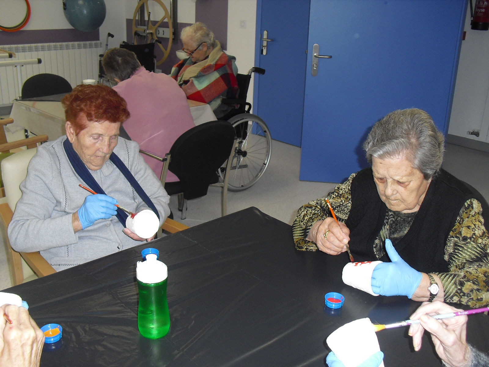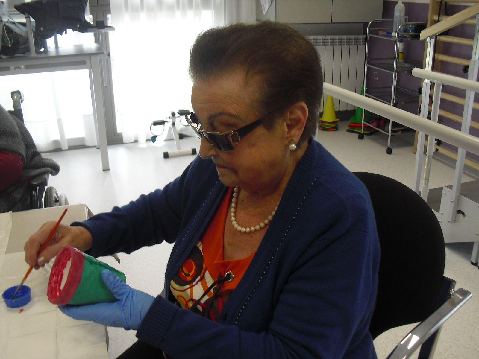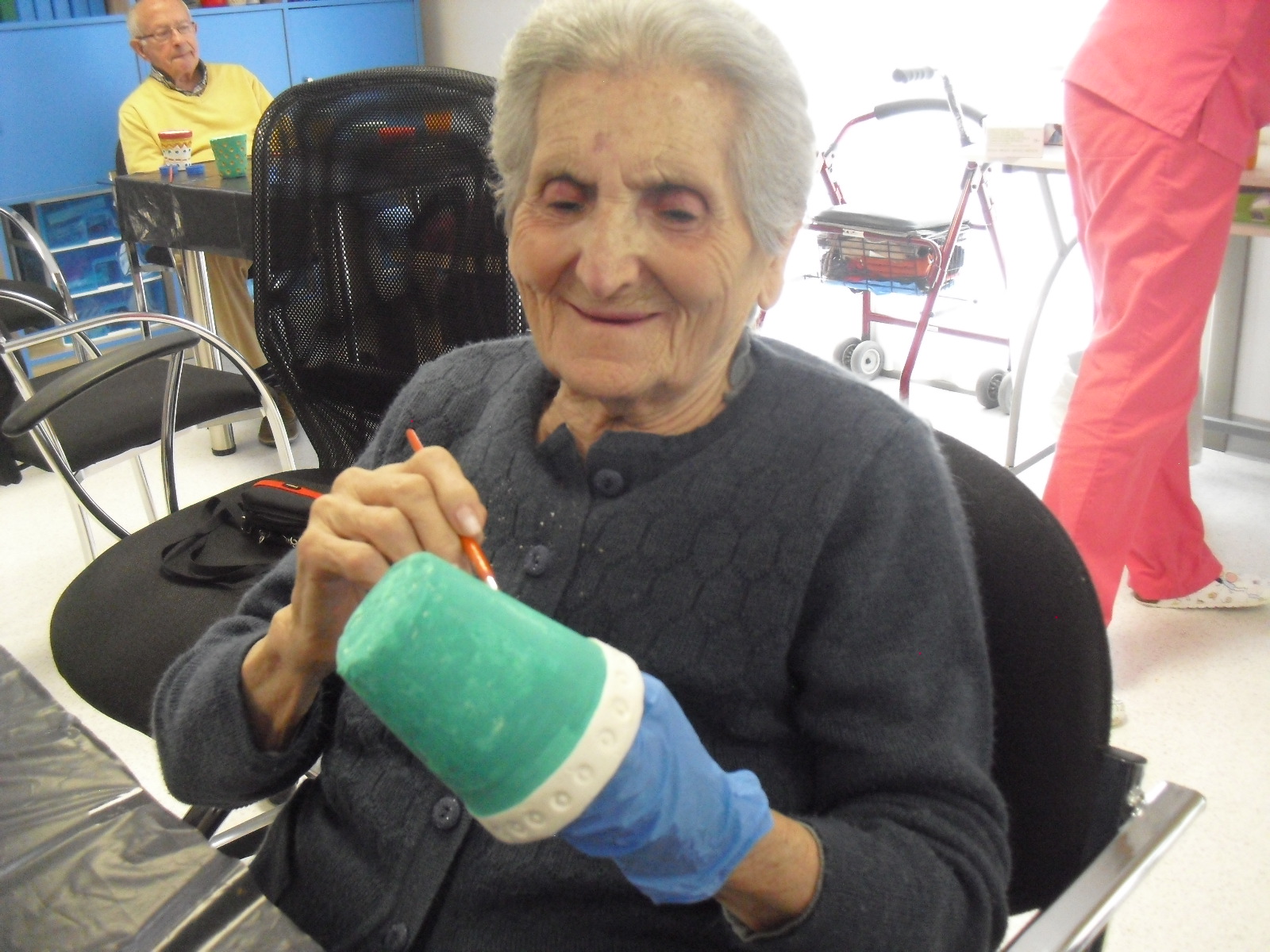 La concentración de nuestros abuelos es máxima en los talleres que están elaborando. Respecto al taller de arcilla han empezado a pintar esos vasos que han modelado de distintos colores y da gusto verles trabajar con tanto entusiasmo. Nuestra sala de terapia se usa al 100% con los talleres y las actividades, hay que dar un gran aplauso a Laura y Bea, porque se están esforzando mucho en pesar en esos talleres, en montarlos, ayudar a los abuelos a elaborarlos...estoy muy orgullosa de ellas. Aunque me imagino que para ellas, como para mí, la mayor satisfacción es verles a ellos disfrutando. Tenía pendiente hace mucho poner la foto de la hija de Claudio, Asun, probando la grúa de transferencia. Pienso que es importante que los familiares puedan probar las grúas y comprobar qué sienten sus familiares al utilizar estas herramientas que nos facilitan el trabajo, impiden hacerles daño en muchas ocasiones a la hora de movilizarlos y se pueden utilizar para rehabilitación. En la foto sale la grúa de transferencia, sólo para transferir al paciente de un sitio a otro, pero las bipedestadoras si que sirven para rehabilitación pues fortalecen la musculatura cada vez que se levanta al paciente.
