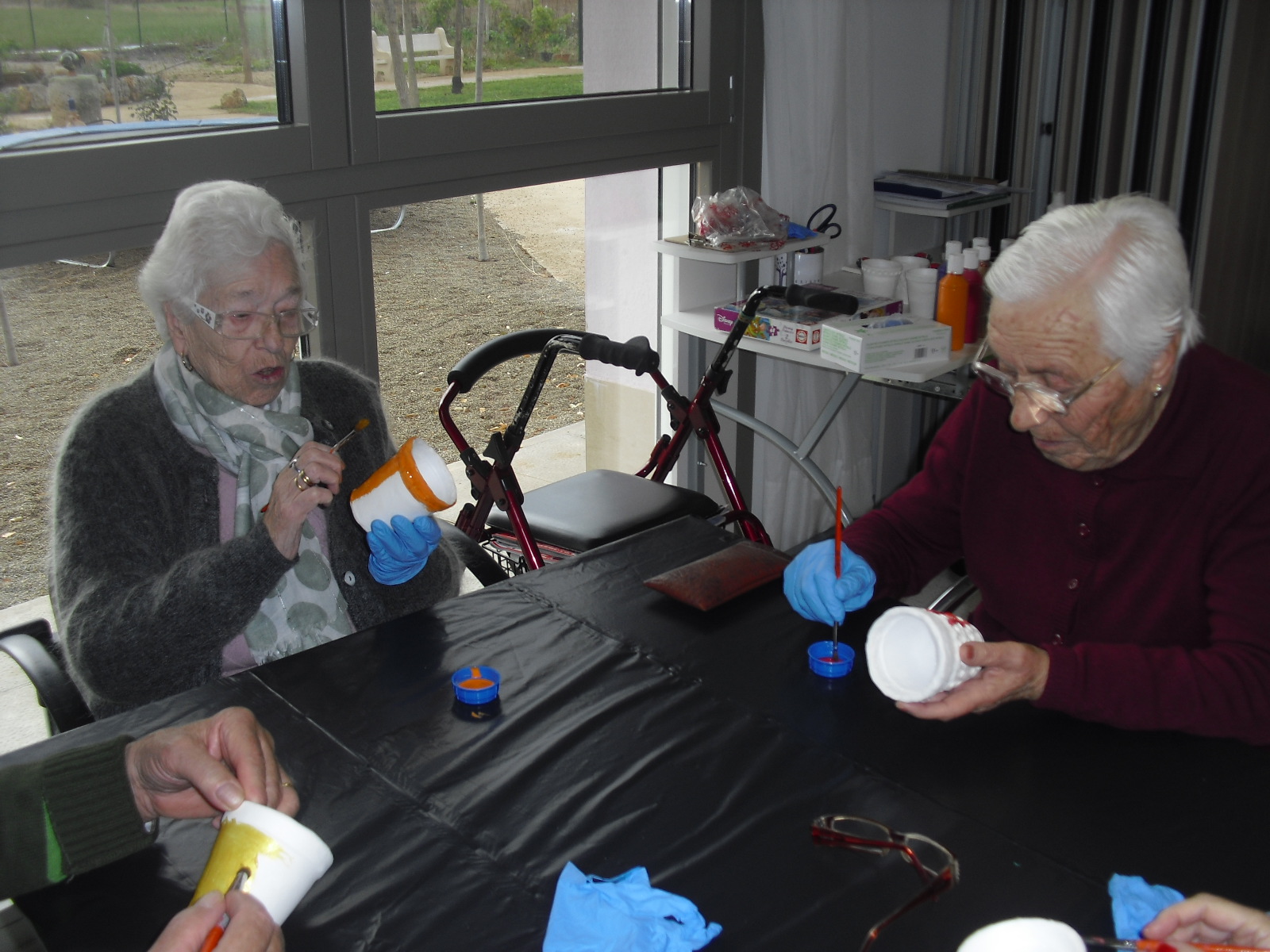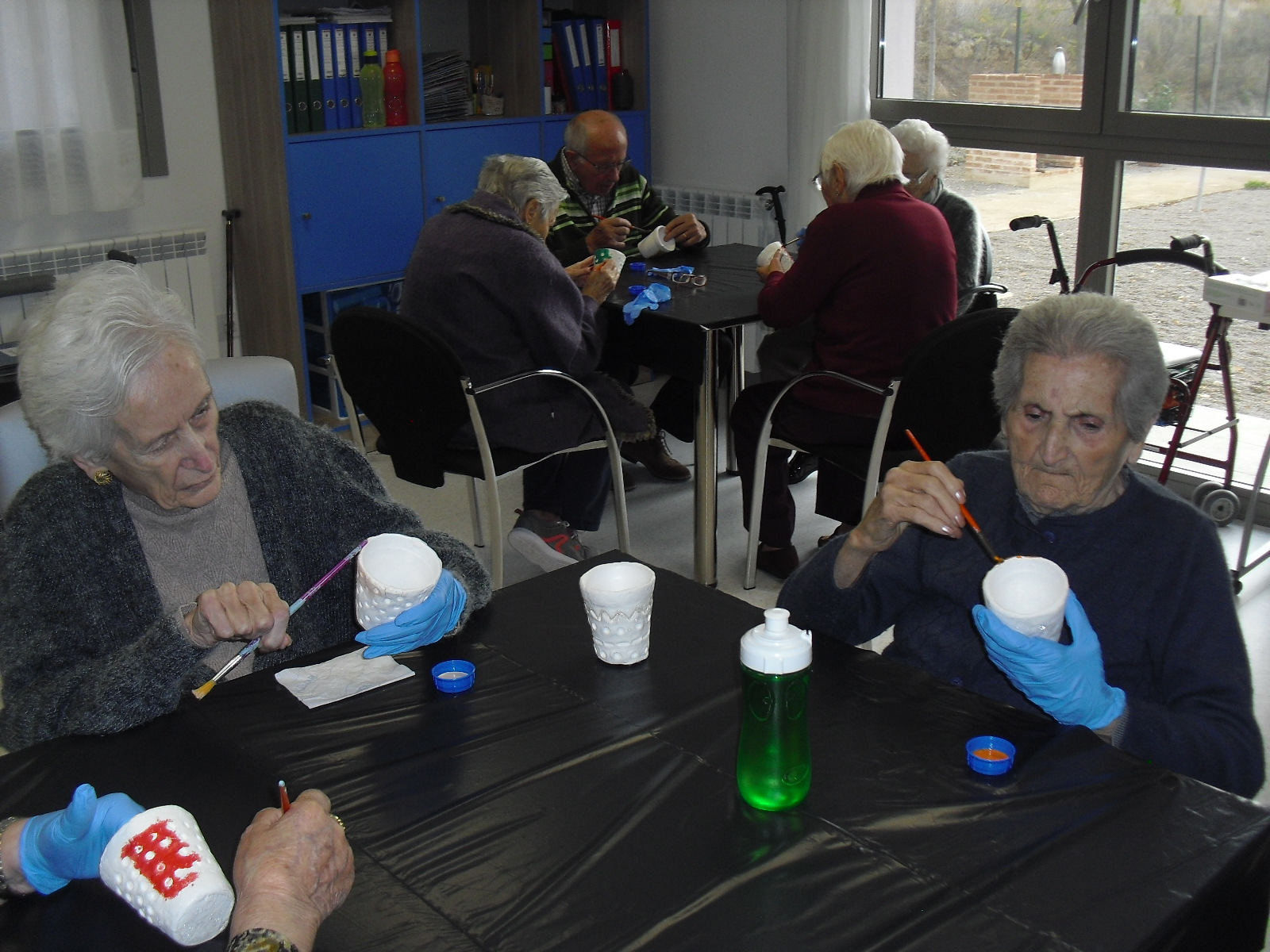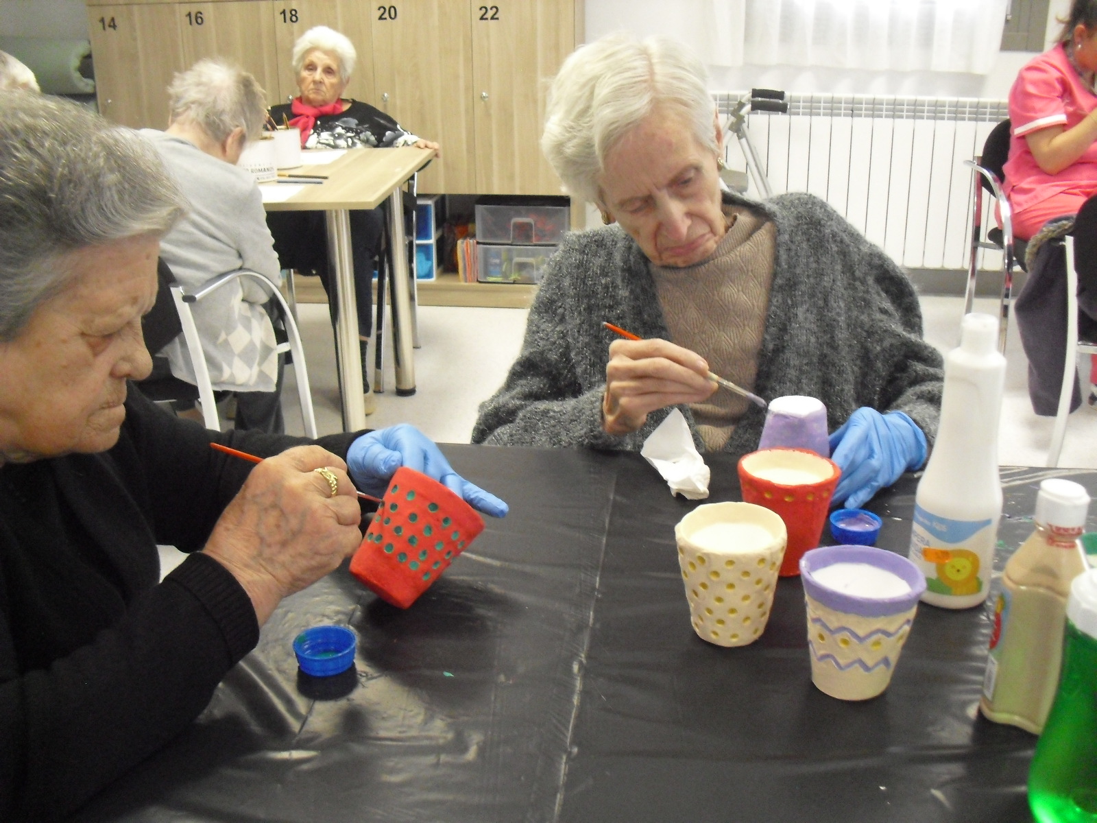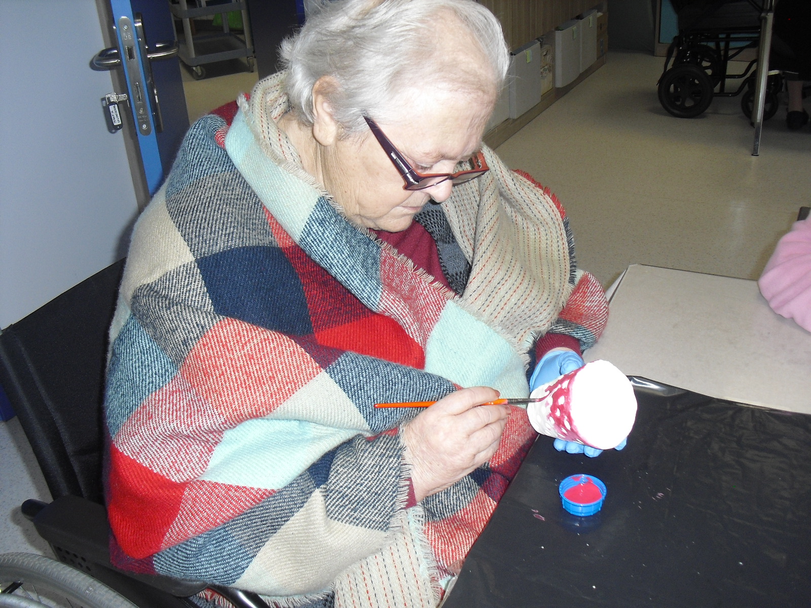 La concentración de nuestros abuelos es máxima en los talleres que están elaborando. Respecto al taller de arcilla han empezado a pintar esos vasos que han modelado de distintos colores y da gusto verles trabajar con tanto entusiasmo. Nuestra sala de terapia se usa al 100% con los talleres y las actividades, hay que dar un gran aplauso a Laura y Bea, porque se están esforzando mucho en pesar en esos talleres, en montarlos, ayudar a los abuelos a elaborarlos...estoy muy orgullosa de ellas. Aunque me imagino que para ellas, como para mí, la mayor satisfacción es verles a ellos disfrutando. Tenía pendiente hace mucho poner la foto de la hija de Claudio, Asun, probando la grúa de transferencia. Pienso que es importante que los familiares puedan probar las grúas y comprobar qué sienten sus familiares al utilizar estas herramientas que nos facilitan el trabajo, impiden hacerles daño en muchas ocasiones a la hora de movilizarlos y se pueden utilizar para rehabilitación. En la foto sale la grúa de transferencia, sólo para transferir al paciente de un sitio a otro, pero las bipedestadoras si que sirven para rehabilitación pues fortalecen la musculatura cada vez que se levanta al paciente.