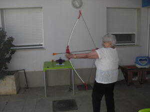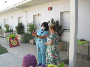 Maribel preparó diferentes pruebas para que los abuelos se clasificaran en nuestras Olimpiadas y se los pasaron muy bien. El tiro al arco les motivó muchísimo y repitieron en varias ocasiones, también tuvieron lanzamiento de jabalina, de disco y de bola. Con el buen tiempo se aprovecha mucho el jardín para las actividades en el exterior. Tenemos este viernes 24 la despedida del verano con Charanga incluida, en la próxima publicación os haremos partícipes de esta actividad. Esperamos que acuda también nuestro cura Federico, pues cuida a todos nuestros mayores cada semana con la celebración de la misa.