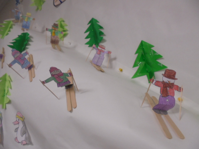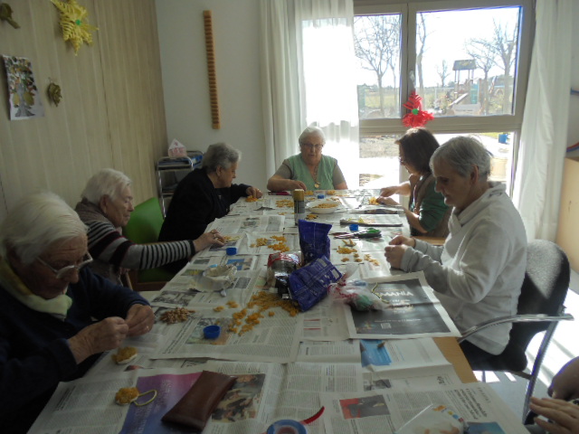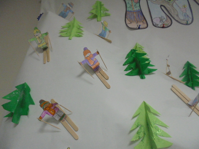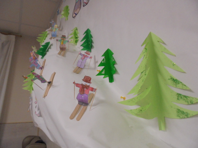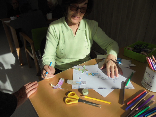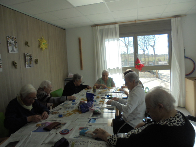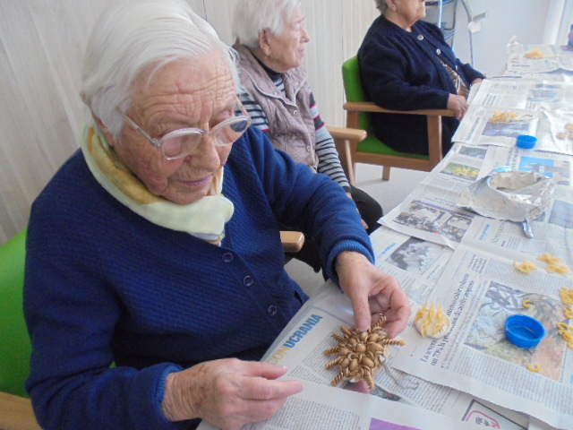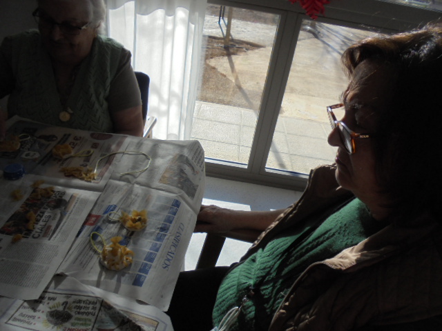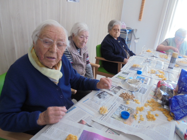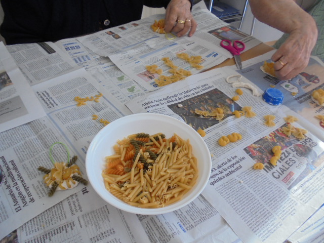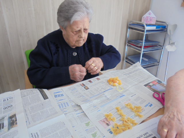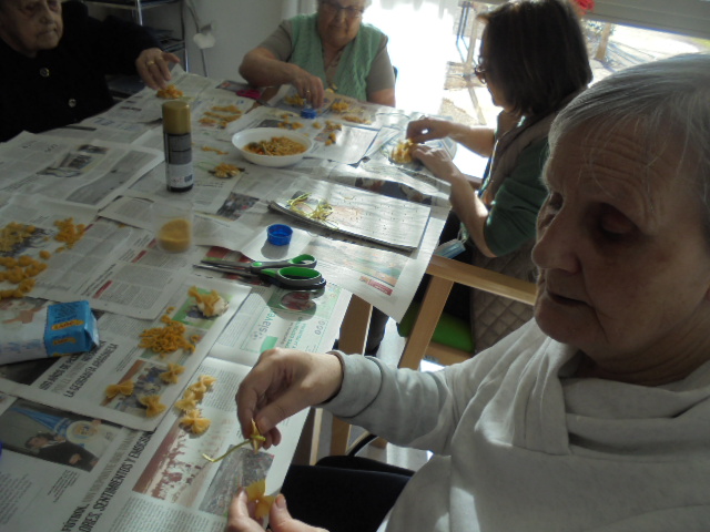 El mural de invierno les ha quedado genial con esquiadores y nieve!! estuvieron trabajando varios días en los talleres para hacerlo y les quedó muy ingenioso. También tenemos la felicitación de Navidad que nos mandaron la familia de Dolores, una residente muy especial ya que estuvo con nosotras muchos años y celebró los 100 años en Romanos, la familia de Mª Ángeles también nos envió una postal muy entrañable y teníamos pendiente poner las fotos del taller que nos enseñó Mª Jesús, la hija de Palmira, que íbamos a hacer con ella pero se nos fue antes de tiempo...pero lo hicieron en su honor: consistía en crear adornos con diferentes formas de pasta y pintarla con spray de color oro. Las he nombrado a ellas tres, pero nos acordamos de cada persona que ha pasado por nuestro centro y ha formado parte de esta gran familia que es Residencia Campo Romanos, y que sin ellos no tiene sentido nuestra existencia pues vivimos por y para ellos!!!!!!!! Un abrazo a todos y todas!!!!!!!