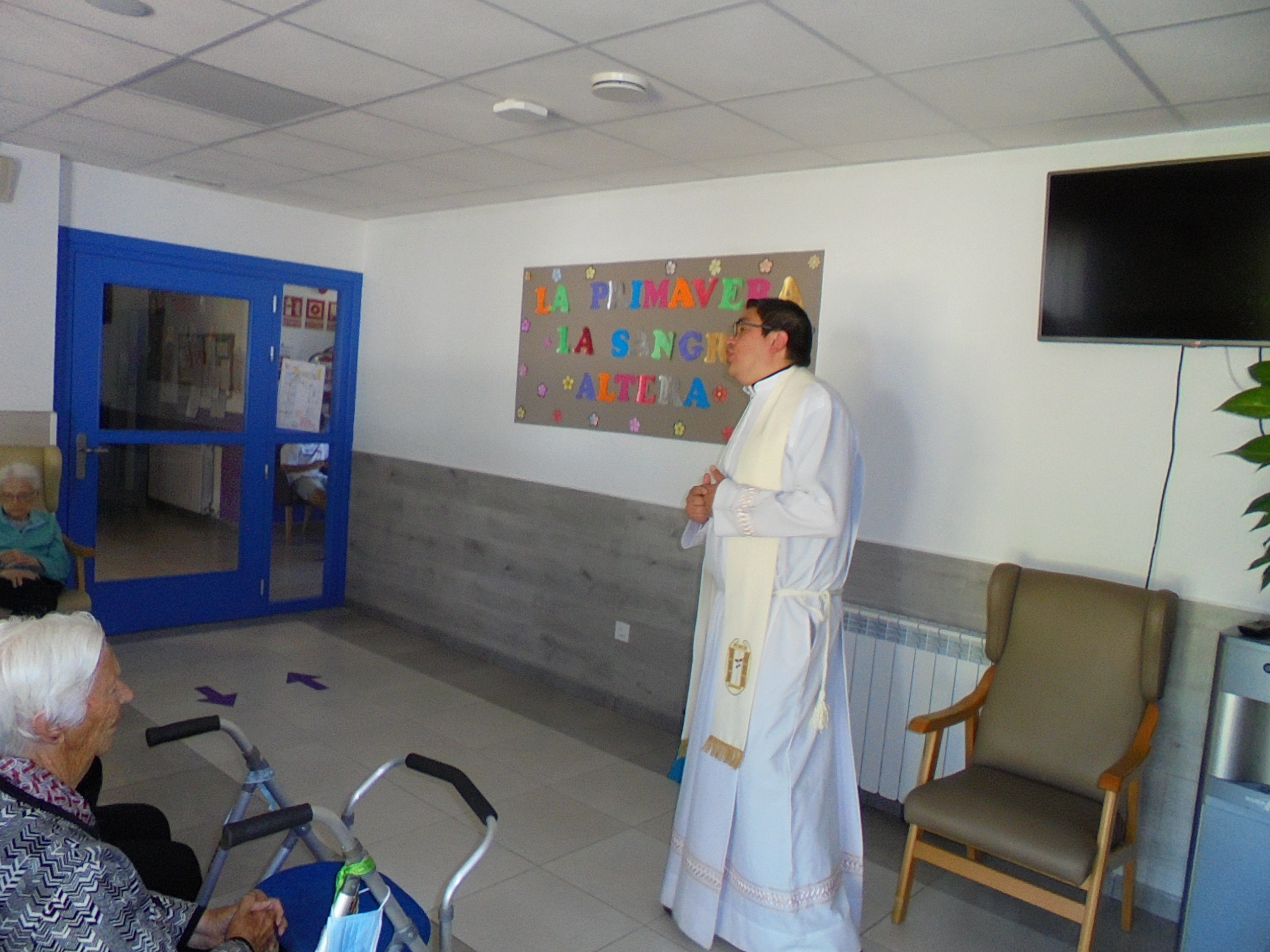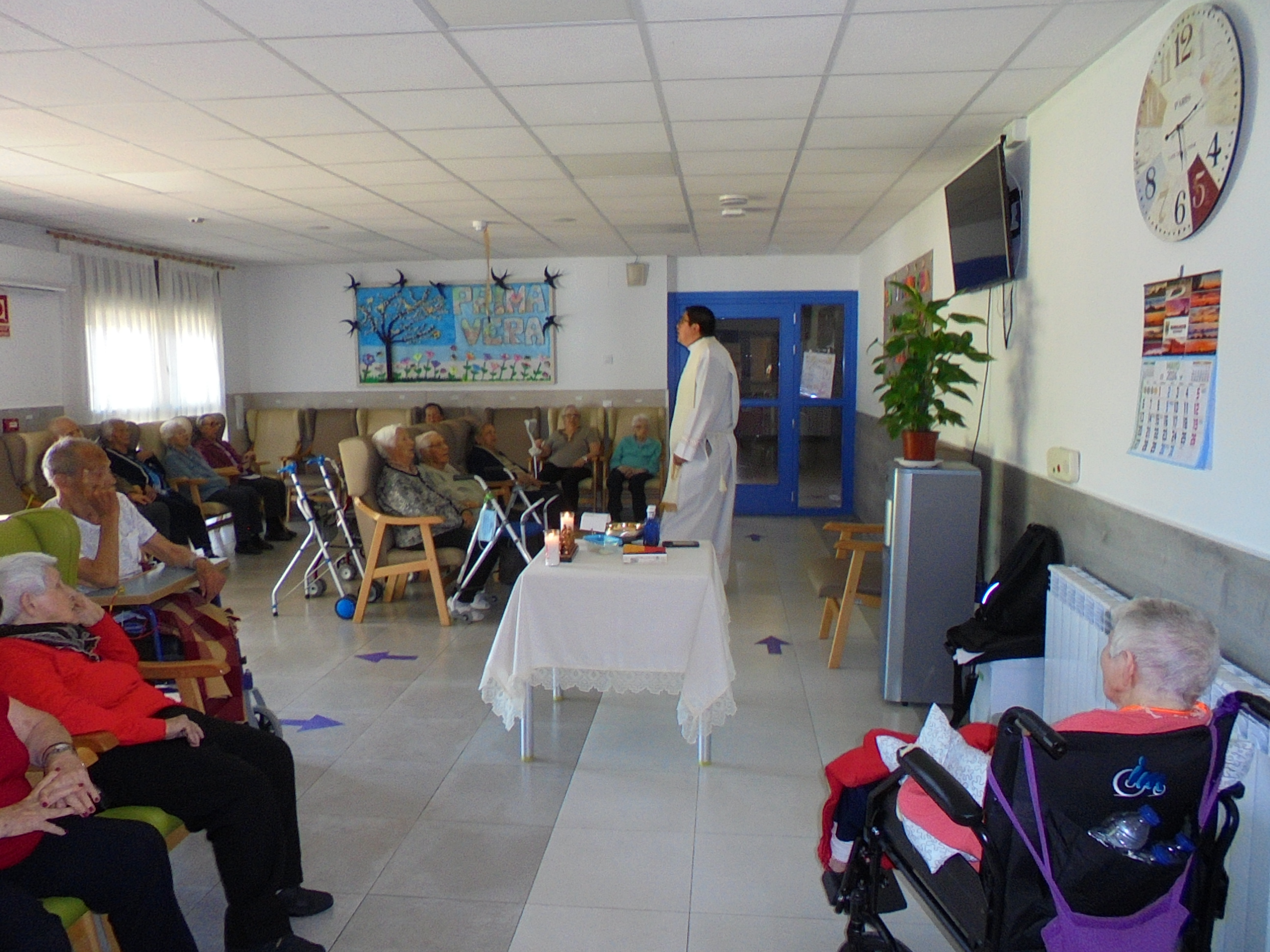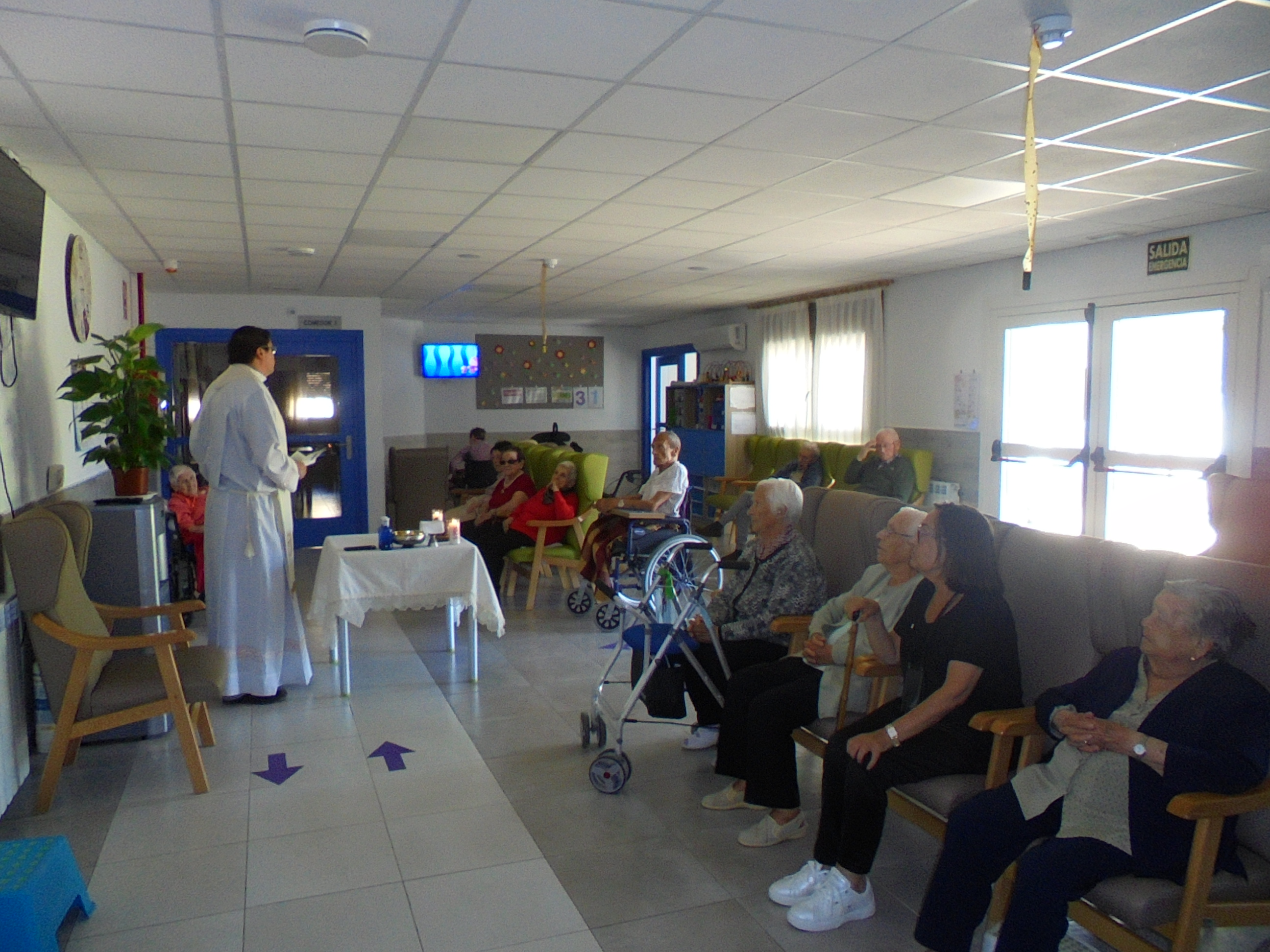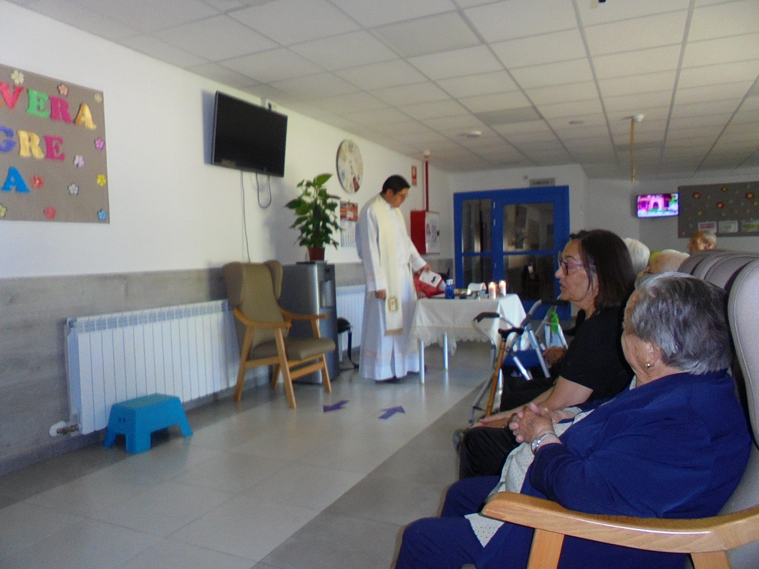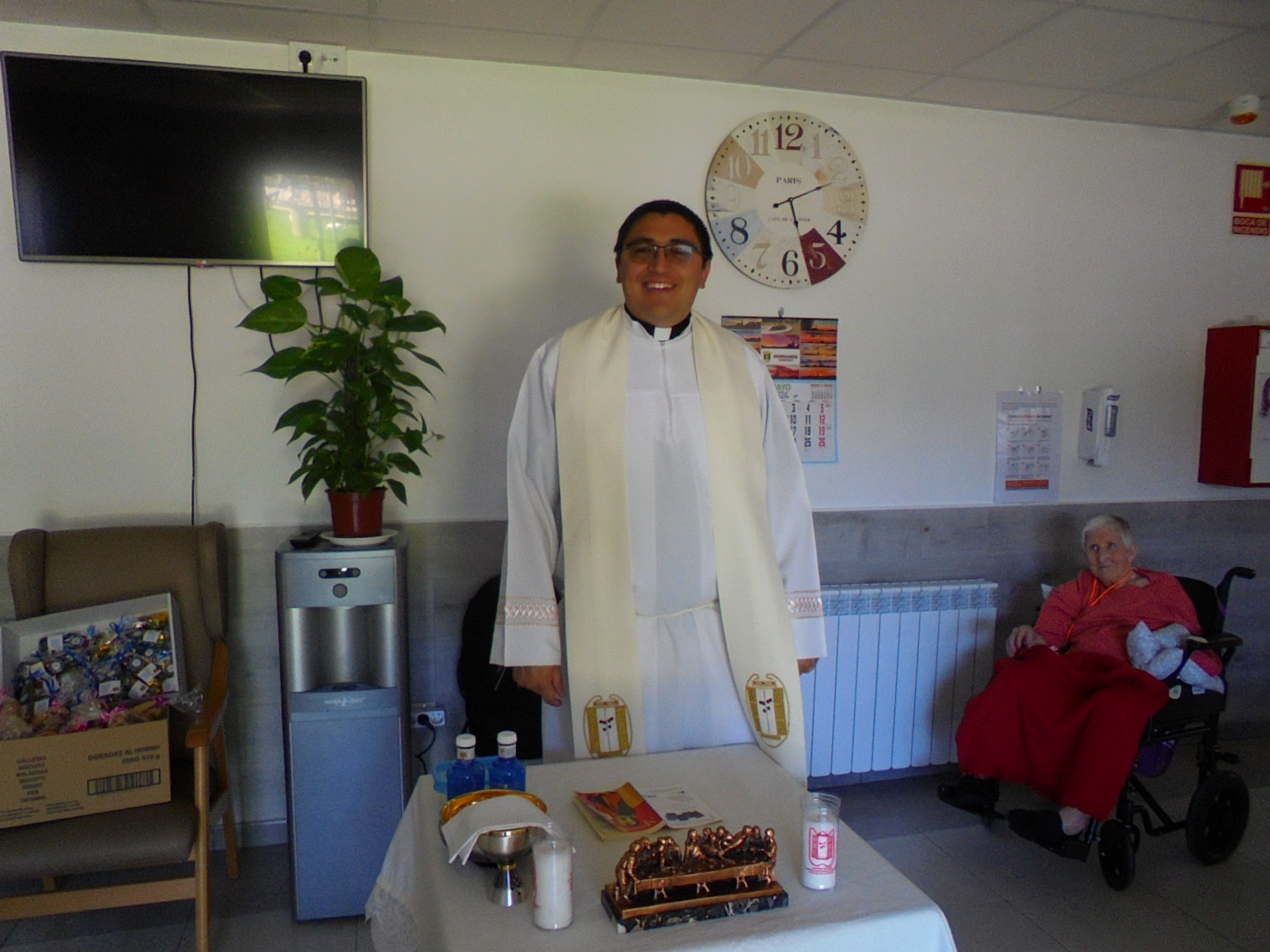 Nuestro querido cura Federico vino el viernes por la tarde a celebrar la misa, he puesto misa del Corpus en honor a Daroca que estaban en las fiestas del Corpus y además nos trajo un obsequio de la Esclavitud y Damas del Santísimo Misterio: unas galletas de té y unas frutas de Aragón!!!!!!!! Muchísimas gracias!!! También ponemos la celebración del cumpleaños de Esther con un bizcocho casero de chocolate  que trajo su hijo y Mª Luz invitó a chocolate a la taza y bizcochos. No nos ha faltado de nada estos días!!!!!!!