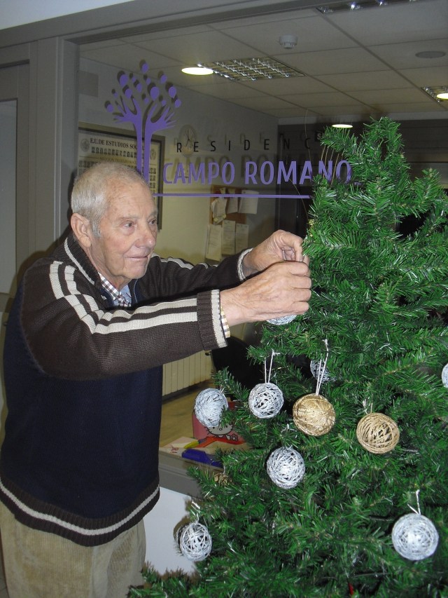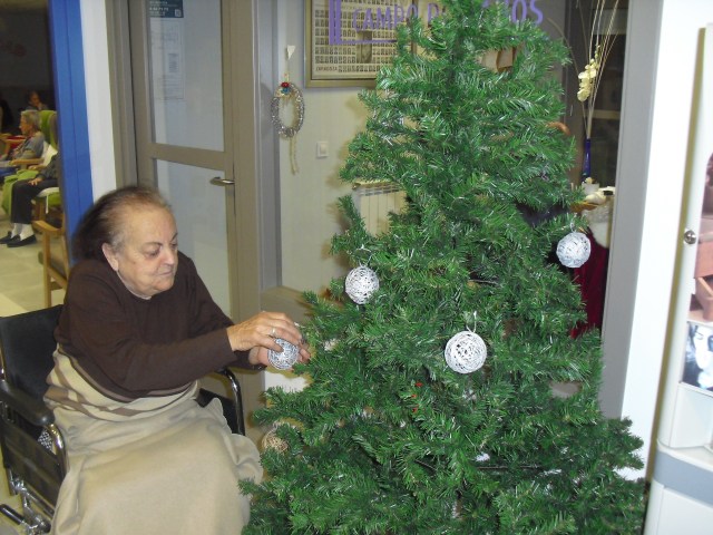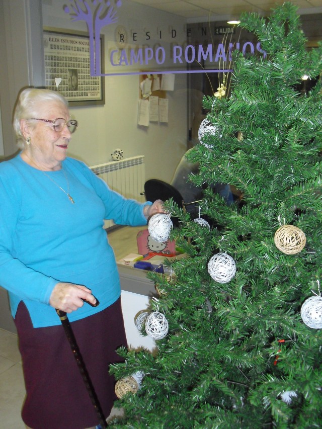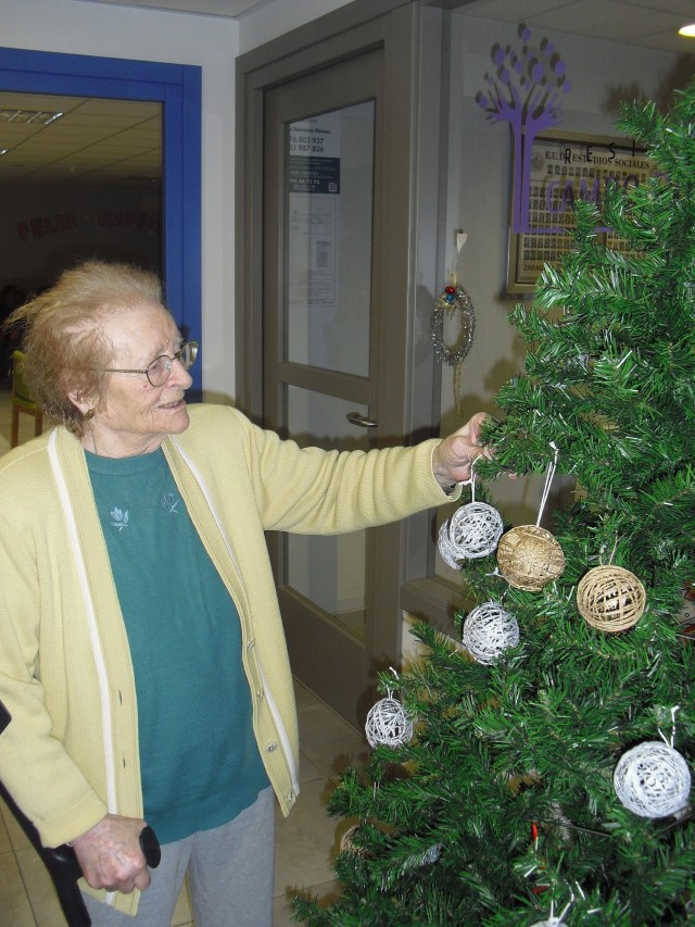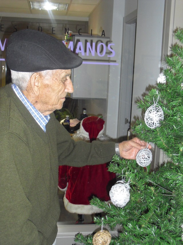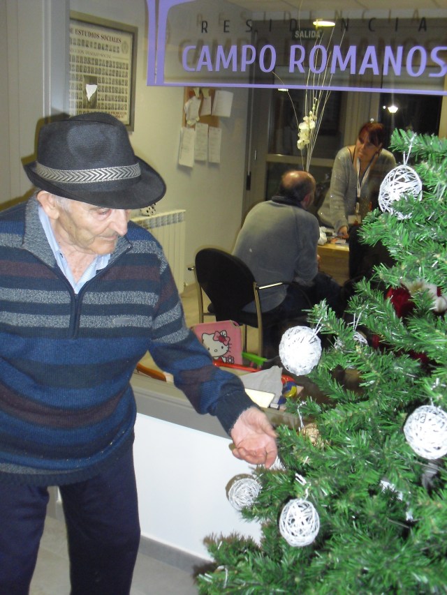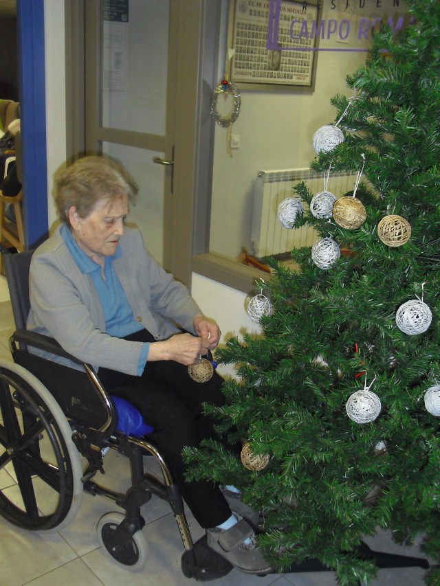 Javier, Victorino y Pablo encargados de montar el Belén, un regalo de Pablo con los adornos de Navidad que hemos colgado por toda la residencia. La próxima semana os cuelgo la foto del Belén terminado. Además la residencia Roma, dónde trabajo y que en este mes se cierra por jubilación, nos ha cedido su arból de Navidad. Estamos reciclando todo lo que podemos y Laura, la terapéuta, se ha currado las bolas del árbol con todos y ya lo han adornado!!! Lo que más me ha gustado de la semana es que tengo un abuelico que cuando me ve entra en el despacho, se sienta y me pide que le quite los calcetines….yo me rio mucho, me arrodillo y se los quito. Pues con tan poco se le puede hacer feliz!!!