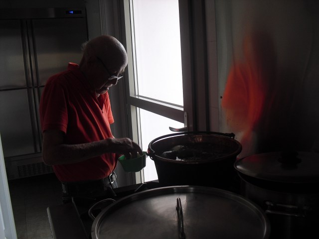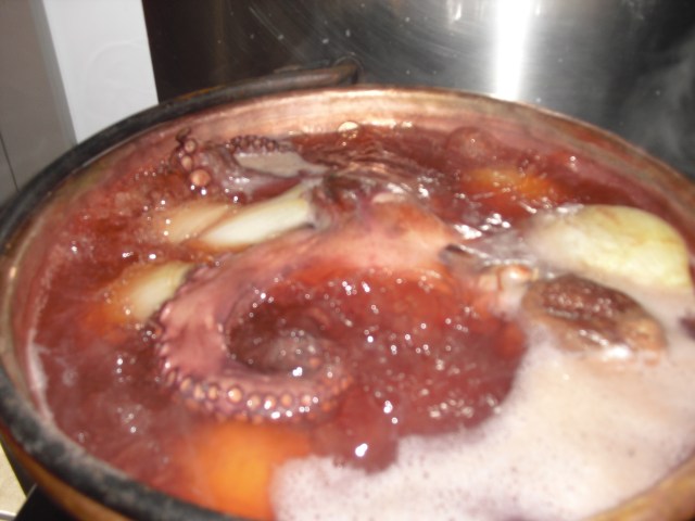 Luis, uno de los residentes más activos que tenemos, ya nos ha deleitado otras veces con sus platos pero esta vez me ha pedido que le trajese un pulpo!!!,  pues quería cocerlo en una cazuela de cobre que tiene para esos menesteres, con su patatita a estilo gallego…co