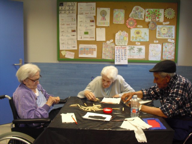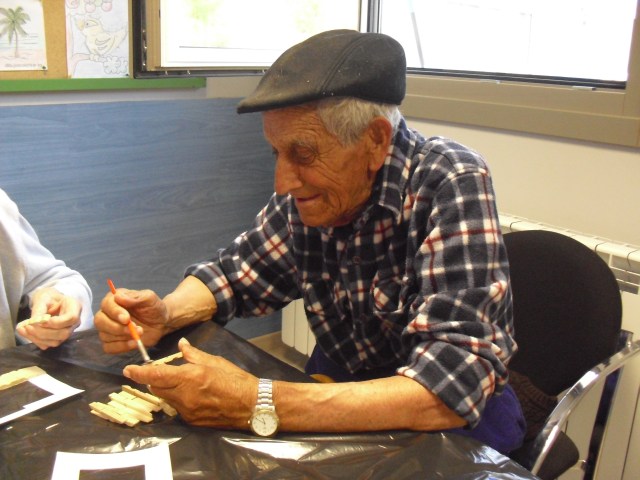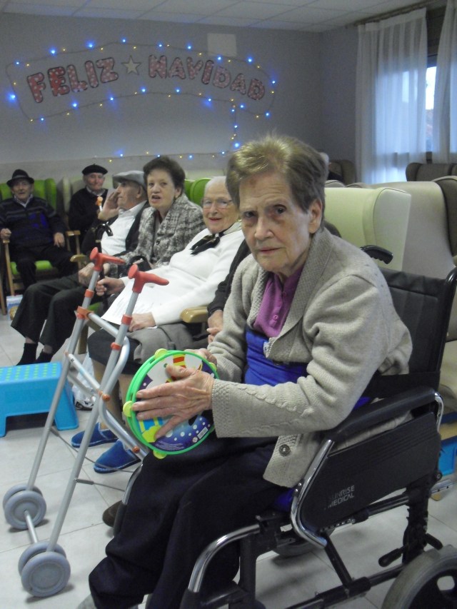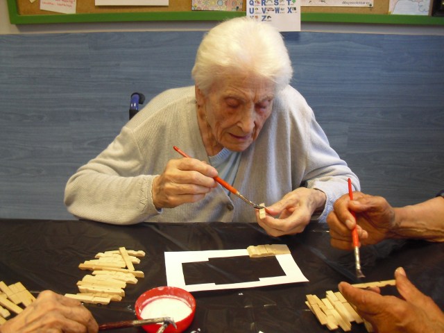 Nos despedimos de Carmen todo el equipo pues siempre fue muy especial, nunca quería estar entre los demás, siempre reclamaba atención exclusiva para ella. Todas nosotras nos la hemos llevado individualmente al despacho, alguna gerocultora hasta en su descanso, a la  enfermería… Nunca conseguimos consolarla del todo pues su gran deterioro cognitivo y la pérdida de su esposo hizo que no quisiera estar con nosotros. Ha tenido suerte de tener una gran familia que la visitaban muy a menudo, la querían muchísimo y ella estaba superfeliz con ellos. Nuestro más sincero pésame y ójala hubiésemos conseguido hacerla sonreír mucho más pues se lo merecía… pero se nos resistió. He rescatado tres momentos en los que estaba feliz, pues con la música se la estimulaba positivamente: en Navidades tocando la pandereta, un día cantando con el  Karaoke y el día de la excursión a Muel que la acompañó uno de sus hijos. El viernes hicimos la excursión a la piscina pero como Carmen no pudo venir al estar ingresada las vamos a poner la próxima semana por respeto. Y vamos a poner unas fotos del taller de los marcos de fotos que han hecho con Laura, la terapéuta ocupacional.